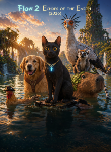 The flood has left a world reshaped, but silence remains the most powerful language. In Flow 2: Echoes of the Earth, the “wordless poetry” of the original masterpiece evolves into a “high-stakes” journey of survival. As the waters recede, a new landscape of emerging archipelagos presents a “vibrant yet bone-chilling” reality where the bonds of a “found family” are the only shield against the rising tide of nature’s fury.
